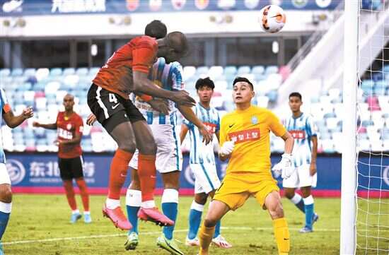 ■广州城队老门将程月磊(前右)目前是自由身。图为去年中超联赛首轮比赛,广州城队对阵长春亚泰。新华社资料图