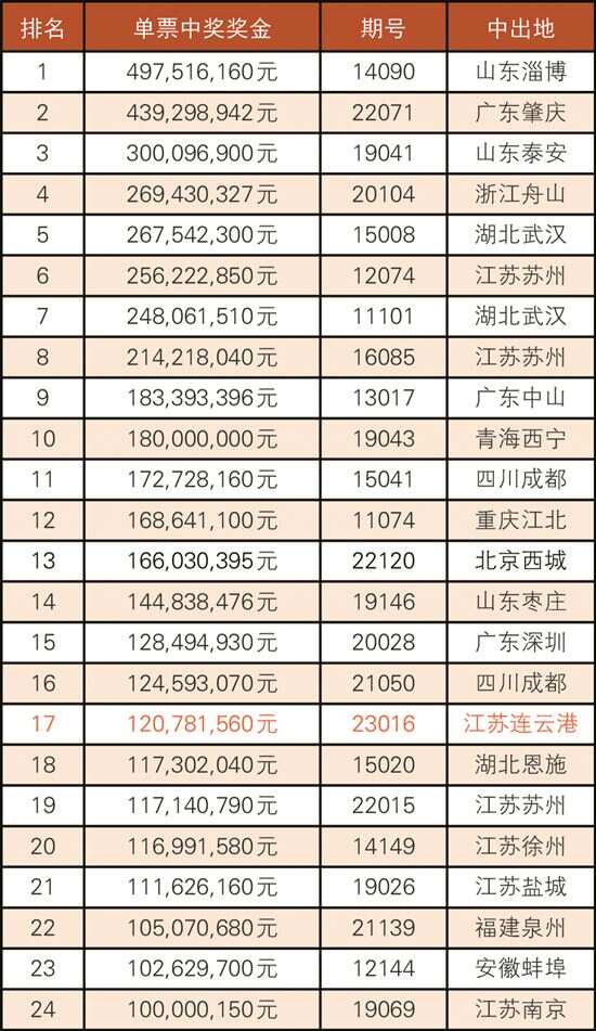 值得一提的是,本期江苏中出的10注1207万余元追加投注一等奖,全部出自连云港一体彩实体店,中奖彩票为一张10倍追加单式票,投注金额150元,单票获奖1.2亿元。