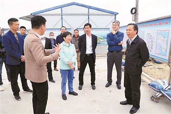 ■越秀集团、广州市交通运输局、广州市城市管理和综合执法局等帮扶单位相关负责人在了解东里对虾养殖项目的建设情况。