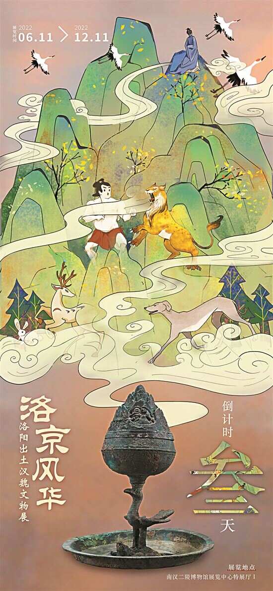 孙玉霞展示了一张由美院学生设计的海报,主体为展品汉代青铜博山炉。它,是古时熏香器物,拳头大小的炉盖上,仙山层峦叠嶂,饰人兽互搏等多个场景,鲜活呈现汉代狩猎场景。“这个与老虎搏斗的男子,一开始,学生把他画成有八块肌肉的‘腹肌男’,这是西画视角和当代想象,并不是我们传统的壁画形象。我们给她找来很多参考资料,包括打虎亭汉墓壁画等。”记者看到,调整后的人物形态润健雄浑,拙朴气息扑面而来。最终,它被选为这件明星展品的背景板,画面中高耸入云的空阔与人虎对峙的凌厉,似乎模糊了展厅与洪荒的界限。