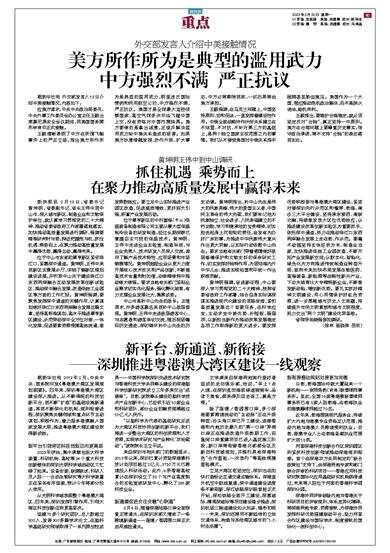 据新华社电 2019年2月,中共中央、国务院印发《粤港澳大湾区发展规划纲要》。四年来,深圳粤港澳大湾区建设深入推进。从不断涌现的科技创新平台,到不断“扩容”的基础设施新通道,再到不断深化的机制、规则衔接进程,深圳聚焦关键领域和重点环节主动谋划、积极作为,着力服务港澳融入国家发展大局,推进粤港澳大湾区建设取得新成效。