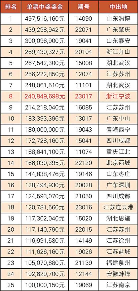 值得一提的是,本期浙江宁波中出的23注1047万余元追加投注一等奖,全部出自同一家体彩实体店,中奖彩票为一张经23倍投的、1注号码、69元投入的单式追加倍投票,单票中奖2.4亿元。此次大奖是继2月15日第23016期江苏一人独中10注追加一等奖摘得1.2亿元后,超级大乐透连续第二期爆出亿元大奖,也是该玩法2023年爆出的第二个亿元大奖、历史上中出的第25个亿元大奖,排名第8位。