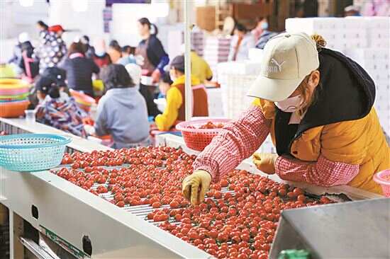 扶好一个产业,不但在田间地头能促进就业,加工环节也能大量促进就业。在长山村的一个圣女果场,工人们正在这里从事分拣和打包圣女果等工作,平时有90多人,高峰时达到130多人。果场负责人之一邱启如告诉新快报记者,这里一年就能带动村民每人增加三四万收入,而且厂里有冷库、冷链,可以为农户提供更好的销售保障,经他们果场分拣批发的圣女果一年有近500万元。为了扶持这个果场,驻马踏镇工作队为他们对接了工会组织、企业、合作商店等很多销售渠道,让他们更稳定地发展。