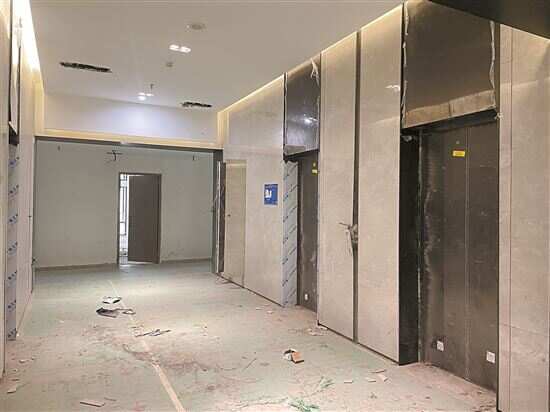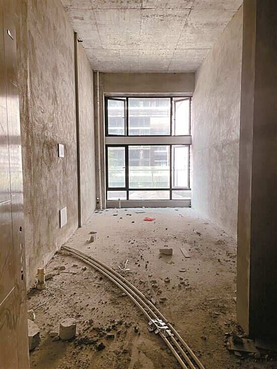 2月28日,在鸿坤创智天地鸿坤财智大厦1号楼现场,记者所见,大厦外立面处于完工状态,而在内部,还是处于施工状态:多个单位墙面并未扇灰,地面外露多条管线,还未达至毛坯状态;部分走廊楼道天花也未完成,电梯仍未完工,施工现场仍存在不少水泥砖石。