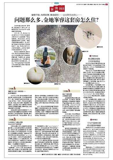 陈先生没想到的是,新房交付后,陈先生发现房屋内部和小区公共区域都出现不同程度的质量问题,“问题那么多,金地峯睿这套房怎么住?”开发商的消极态度更是令他倍感无奈。对此,广州市金裕房地产开发有限公司向新快报记者表示整改措施正积极推进中。