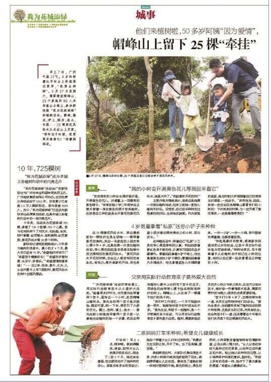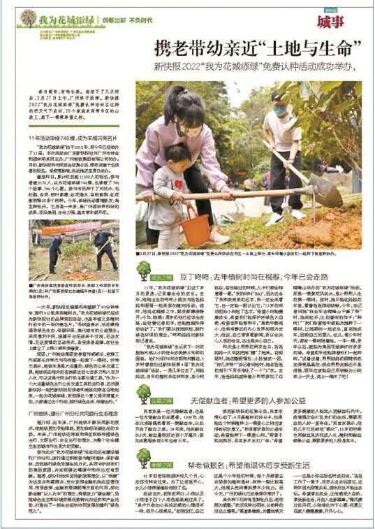如今,“我为花城添绿”已成为新快报社品牌策划活动,也是羊城义务植树行动中的一张闪亮名片。其秉持倡导绿色生态、低碳环保、美化城市的公益理念;采用惠利于民,搭建平台促进亲子交流、见证友情、见证爱情的互动形式,备受读者追捧,在民间建立了上乘口碑和美誉度。