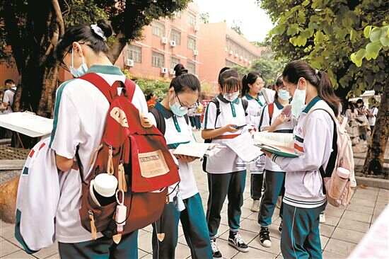 ■语文科目开考前,在广雅中学考点门外,考生们手拿学习资料,做好考前的准备。(资料图)