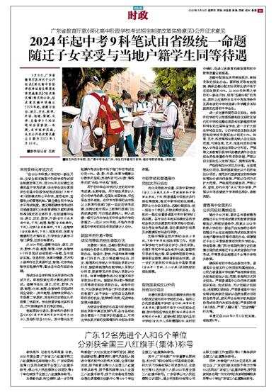 3月8日,广东省教育厅发布关于公开征求《深化高中阶段学校考试招生制度改革实施意见》(征求意见稿)意见的公告,征求意见稿中明确从2024年起,道德与法治、语文、历史、数学、外语、地理、物理、化学、生物学9个科目笔试由省级统一命题,各市组织实施。此次公开征求意见截止日期为2023年3月16日。