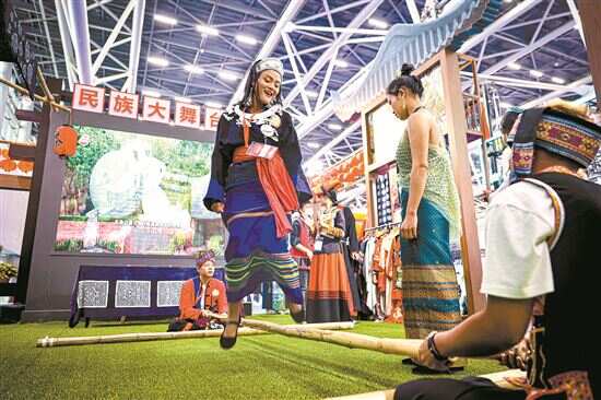 ■民族交流区内,工作人员跳起了欢快活泼的竹竿舞。
