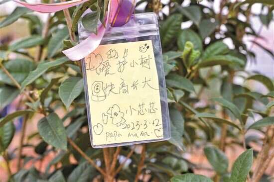 星期天遇上植树节,近水楼台的一家三口早早就到了,他们也几乎是现场第一个完成种树的家庭。赵恩和拿起铁锹时还有些费力,以前家里只种过韭菜和草莓,这还是她第一次实打实种树。在爸爸的指导下,她认真挖土、浇水,这种新奇的感觉又累又好玩。种完树后,恩和写下了充满诗意的一句话:希望我们的生活像桂花一样香。