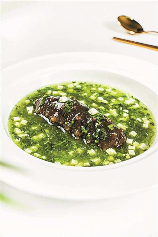 珠海瑞吉酒店宴庭中餐厅日前将诗情画意的春韵化入味蕾,上新精心烹制的争鲜春馔。除了精心雕琢、创意灵动的装盘外,主厨林岳初在口感上亦注入了众多巧思,以烹饪之道演绎春日气质。一道芥菜白玉煮辽参甄选上乘辽参为主料,加入芥菜、豆腐粒及蛋白烹调,饱满润滑的辽参似黑宝石般浮在碧波荡漾、绿草悠悠的清鸡汤上,呈现风和日丽的优雅春味。