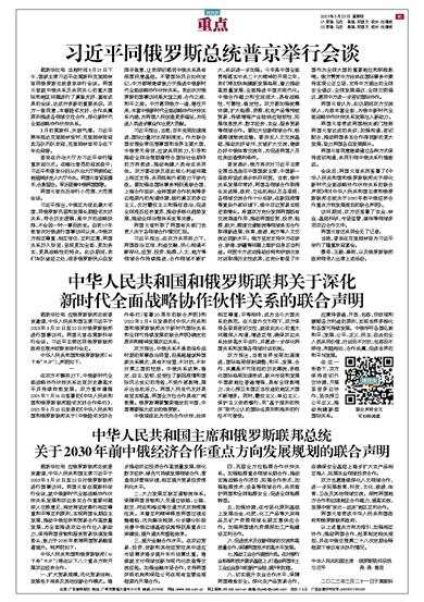 据新华社电 应俄罗斯联邦总统普京邀请,中华人民共和国主席习近平于2023年3月20日至22日对俄罗斯联邦进行国事访问。两国元首在莫斯科举行会谈,就中俄新时代全面战略协作伙伴关系发展和双边务实合作重要问题深入交换意见,商定将坚定奉行相互尊重和平等互利原则,实现两国长期自主发展,推动中俄经济和贸易合作高质量发展,为全面推进双边合作注入新动力,保持两国货物和服务贸易快速发展势头,致力于2030年前将两国贸易额显著提升。特声明如下: