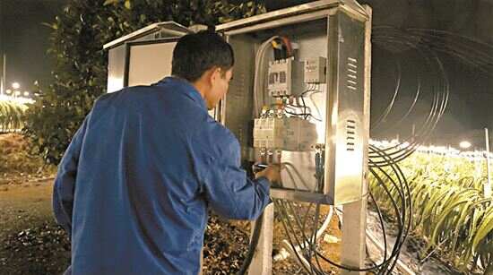 ■种植基地中负责仿太阳夜间催花补光技术灯泡的师傅,被称为火龙果“追光者”。 马斌/摄