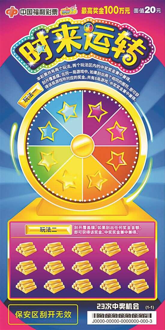 “时来运转”单张面值20元,最高奖金100万元,11个奖级,23次中奖机会,奖金返还率为65%。彩票共设有两个玩法,分别为两同图和即中玩法,简单直接,富有乐趣。其中,玩法一区域内绚丽的霓虹和炫彩的轮盘寓意“大奖快快转起来,好运转起来”,具体玩法为刮开覆盖膜,在同一局游戏中,如果刮出两个相同的图符,即可获得该局游戏所对应的奖金。共有8局游戏,中奖奖金兼中兼得;玩法二区域内耀眼的金条元素寓意“中奖就在眼前”,具体玩法为刮开覆盖膜,如果刮出任何奖金金额,即可获得该奖金。中奖奖金兼中兼得。