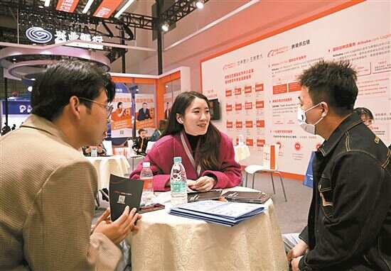 ■3月18日,阿里巴巴国际站工作人员(中)和参观者交流。