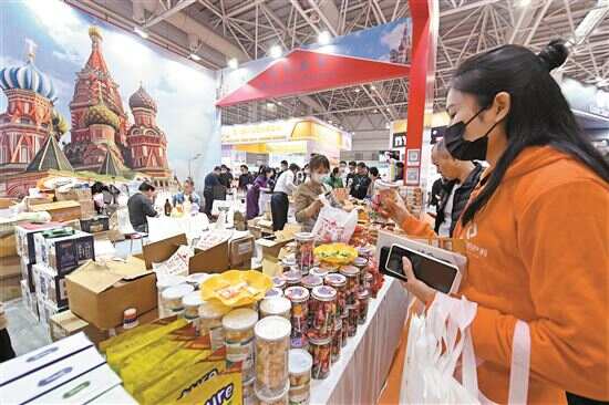 ■3月18日,参观者在2023中国跨境电商交易会俄罗斯馆了解俄罗斯商品信息。