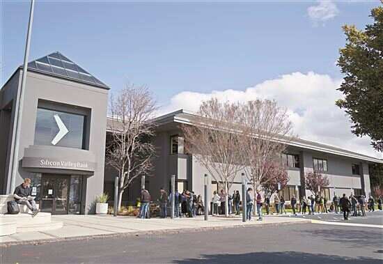 ■3月13日,客户在美国加利福尼亚州圣克拉拉市硅谷银行总部外排队等候办理业务。新华社发
