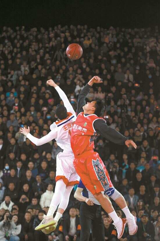 ■3月25日,黔东南队球员解涛(右)和铜仁队球员王连波在比赛中跳球。当日,贵州省首届“美丽乡村”篮球联赛总决赛在黔东南州台江县台盘村开打。这项由台盘村“六月六”吃新节篮球赛发展而来的赛事因为火热的现场氛围和“接地气”的办赛风格,在2022年“火爆全网”,被网友亲切地称为“村BA”。新华社发