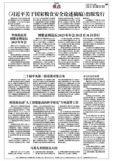 据新华社电 中共中央党史和文献研究院编辑的《习近平关于国家粮食安全论述摘编》一书,近日由中央文献出版社出版,在全国发行。