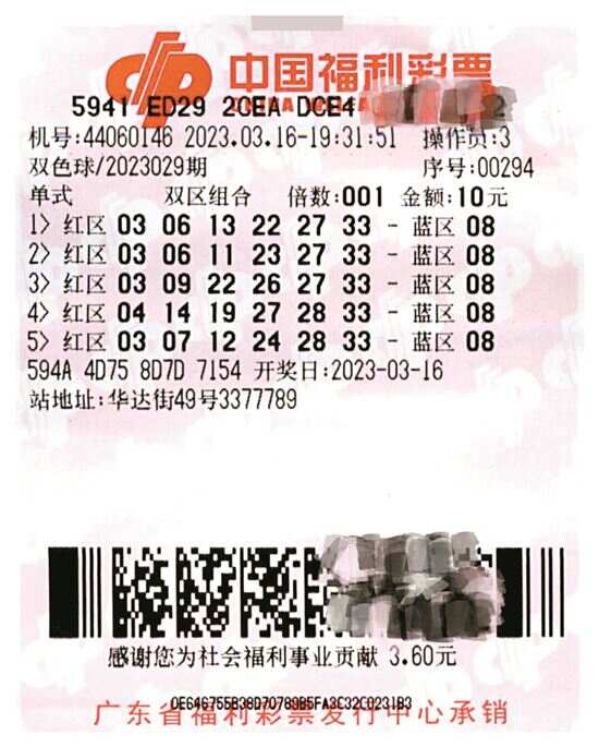 第23029期双色球开奖当晚7时许,小伙子路过44060146福彩投注站。在参考了开奖号码走势图和店家推荐号码后,他很快选定了5组号码进行投注,特别有意思的是,蓝球是刚好看到刮刮乐柜台上“炫8”彩票,就全部选了“8”。
