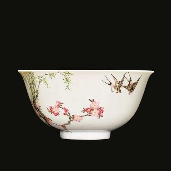 它的艺术造诣非常高。珐琅彩料,初由西洋传教士引入,于北京紫禁城内绘制,罕稀至极,问鼎清代瓷珍之冠。“康熙末年,禁宫珐琅作坊,毗邻天子寝宫,画师受皇帝亲自严谨监督。杏林春燕图碗,描写细腻自然,捧碗观图,犹若卷轴缓缓展开。此类珐琅彩瓷造于北京,前后仅短暂一段时期,可谓雍正朝特有,本品书乾隆年款,应属初年之作,若论品质与风格,几与雍正作例无异。此类珐琅彩瓷为数甚稀,存世者多为台北‘故宫博物院’藏品,其艺术造诣至美臻极,无论是督陶官唐英领导下之景德镇御窑厂如何努力,亦无法超越的。”