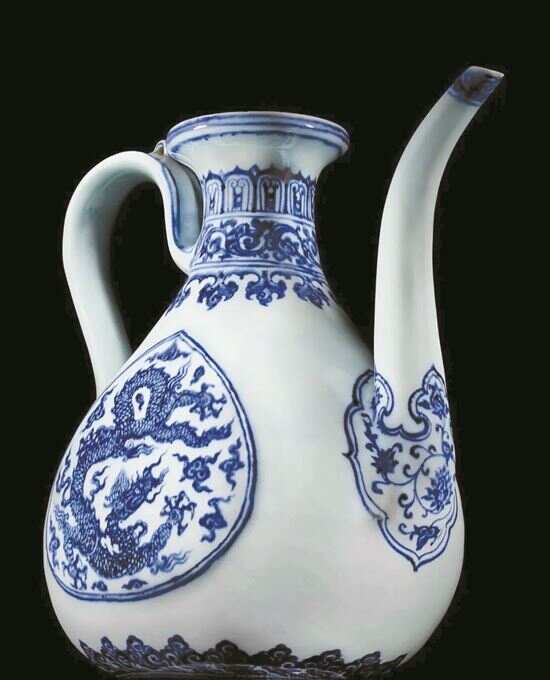 龙纹显示出它在陶瓷史上的重要意义。“壶身妙画五爪云龙,龙目圆瞪,短发扬起,仿佛刚从高空降临,旋即展腿张爪,便欲驾云腾飞,英姿矫健,身置桃式开光中,却不感拘束,自在傲翔。如此龙纹,宣德朝以前者极罕,但后来的明代御瓷上却甚惯见,或正因此故,此壶在中国陶瓷艺术历史上的超凡重要性,过去未获充分肯定。”