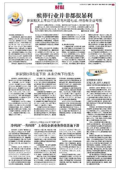 清明时节,殡葬业再度进入人们视线。据新快报记者不完全统计,A股及港股市场共7家涉及殡葬行业公司,目前已有多家赶在清明节前公布了2022年财报。记者观察到,殡葬行业毛利率高,但业绩走向却呈现分化态势。有公司连续多年营收净利双增,堪称殡葬业中的茅台;有公司多年来增收不增利;亦有公司营收净利双降,深陷诉讼泥潭。