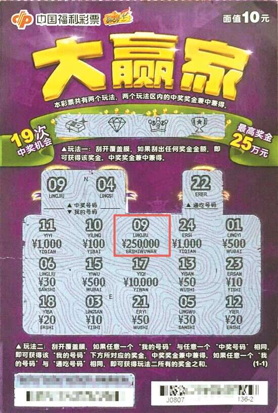 刮刮乐“大赢家”游戏是中国福利彩票新推出的一款财富类主题彩票。游戏票面设计丰富立体,主题鲜明,“大赢家”金色3D标题字非常抢眼,王冠、飘带、五角星盾牌元素充满了财富感及游戏感。金色标题字搭配紫色背景,色彩冲击感强,活力四射。彩票设有两个玩法区,玩法一奖金即中,简单明了且富有乐趣;玩法二号码比对,附加“通吃号码”玩法,中奖体验感十足,给每一个爱心购彩者成为“人生大赢家”的快乐体验。该款彩票单张面值10元,共有19次中奖机会,最高奖金25万元。