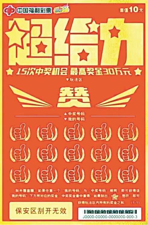 据悉,福彩刮刮乐“超给力”票面色调整体由红、金构成,直击重点,简洁明快,主题突出,即买即开即兑,返奖率高达65%。该票分为10元、20元、50元三款面值,对应头奖分别是30万元、80万元、100万元。统一采用的“对数字+特殊图符”玩法,简单易上手,很受广大彩民朋友喜爱。该彩民中的,便是10元面值的最高奖。