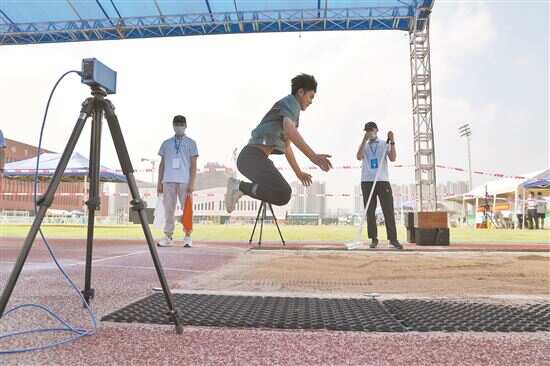 4月17日,广州市中考体育考试开考,在清华附中湾区学校,考生进行立定跳远考试。新快报记者 李小萌/摄