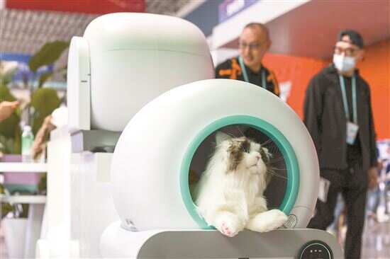 ■一家中国工业设计企业在第133届广交会上展示的全自动猫砂盆等宠物电器。 新华社发