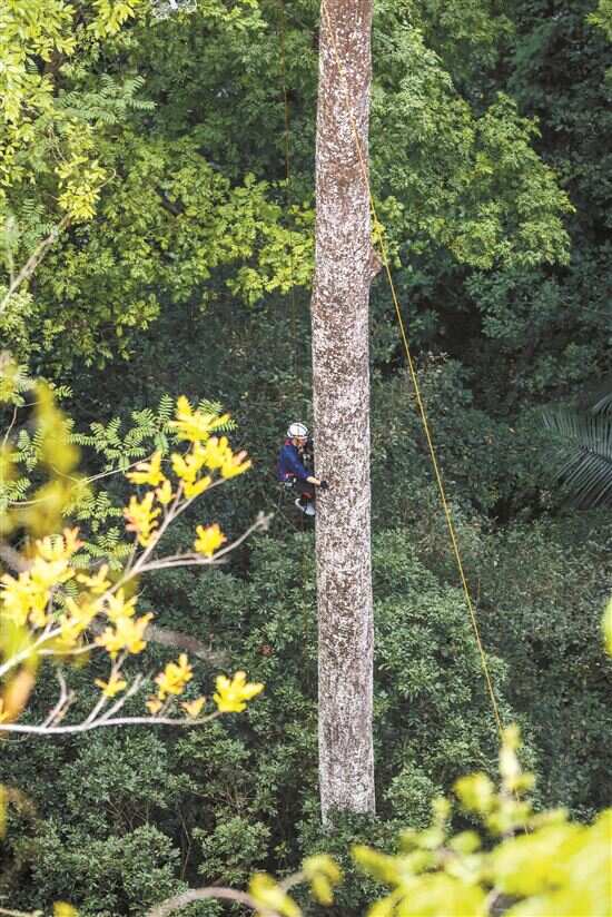 ■南宁蓝天救援队的黄贤铭在攀爬望天树,准备安装测量树高的超声波信标。新华社发
