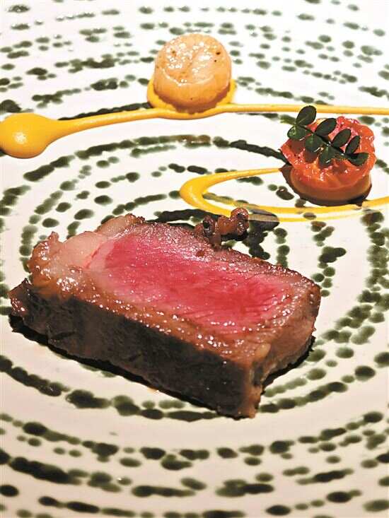 煎到三成熟的新西兰银蕨精备菲力(“精备菲力”四个字简单解析一下,精备相当于要求,菲力等同于部位),外表略焦,很好地锁住了肉汁的丰沛,蘸一点点玫瑰盐,入口便有种大满足的咀嚼力在张扬。