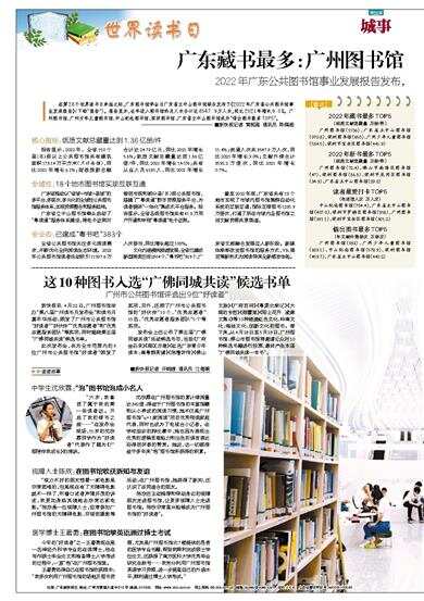 在第28个世界读书日来临之际,广东图书馆学会与广东省立中山图书馆联合发布了《2022年广东省公共图书馆事业发展报告》(下称“报告”)。报告显示,全年进入图书馆的总人次合计达8547.9万人次,同比2021年增长9.0%。广州图书馆、广州少年儿童图书馆、中山纪念图书馆、深圳图书馆、广东省立中山图书馆成为“借出图书最多TOP5”。