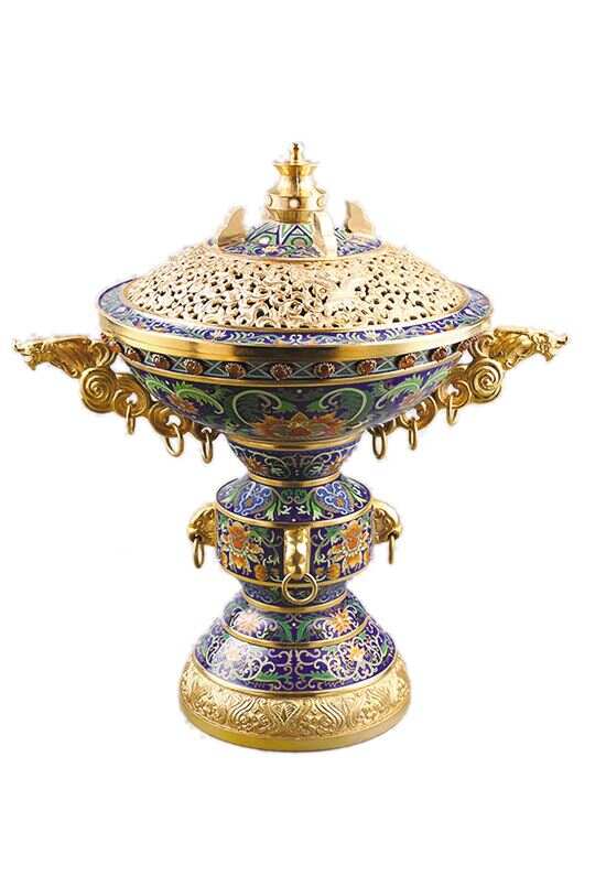 “铜胎掐丝珐琅”顾名思义是以铜作胎,再用铜丝或金银丝掐成各种图案焊接于铜胎表面,以珐琅釉填充其中,再经烧制、磨光、镀金等流程制成,其工艺精细繁复,一件制品从开始到完成要经过上百道工序,是集美术、雕刻、镶嵌、冶金、玻璃熔炼等手工技艺于一体的艺术结晶。