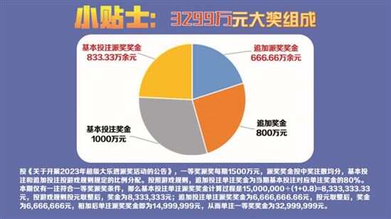 本期,二等奖开出140注,单注奖金为9.86万余元;其中86注采用追加投注,单注追加奖金7.88万余元,根据10亿元大派奖规则,本期共有79注二等奖符合参与条件还可获得派奖奖金,每注多得二等奖派奖奖金6.32万余元,分享派奖奖金后,二等奖单注总奖金为24.07万余元。本期固定奖共派送奖金3626万元。