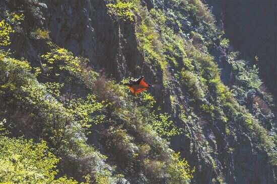 ■4月30日,张树鹏在空中滑翔即将穿越天门洞。新华社发