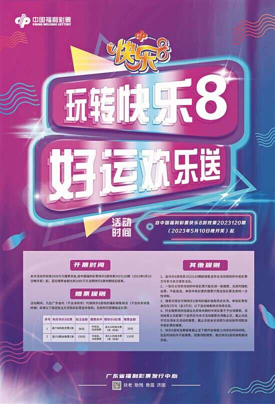 为扩大快乐8游戏品牌影响力,回馈广大快乐8游戏购彩者,广东省福利彩票发行中心自2023年5月10日(快乐8游戏第23120期)起在广东省内(不含深圳市)开展“玩转快乐8,好运欢乐送”中国福利彩票快乐8游戏1000万元赠票营销活动。