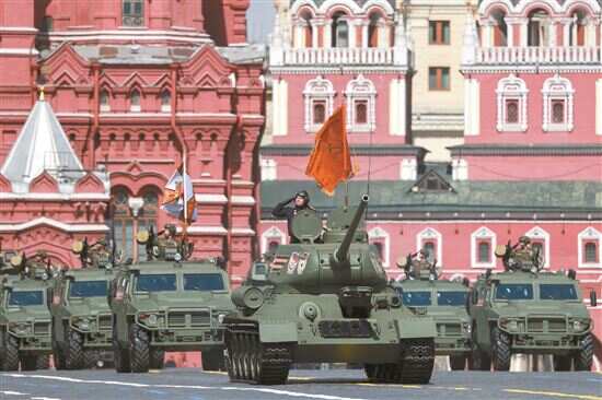 ■5月9日,在俄罗斯首都莫斯科,T-34坦克(前)驶过红场。