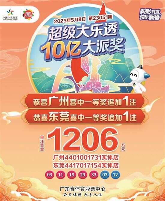 新快报讯 记者陆妍思报道 5月8日,体彩超级大乐透第23051期开奖,这也是超级大乐透10亿元大派奖第13期开奖,当期全国井喷21注一等奖,全国11地购彩者分享惊喜,其中广东中出2注1206万余元派奖追加一等奖,分落广州、东莞。