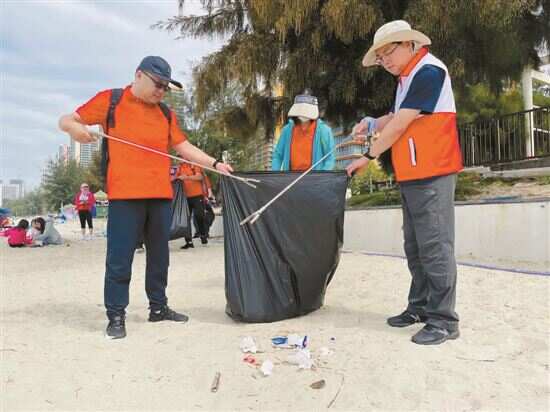 每逢假日,惠东县阿婆角、双月湾海滩均吸引众多慕名而来的游人,惠州体彩志愿者队伍统一着装,一边手持夹子,一边弯腰拾起垃圾,装进垃圾袋,在银滩形成了一道独特的风景线。
