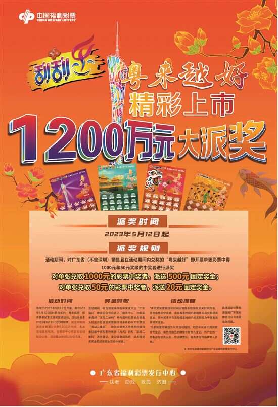新快报讯 记者陆妍思 通讯员莫冠婷报道 为进一步丰富广东即开票游戏品种,依托刮刮乐即开票平台宣传岭南文化,经财政部批准,由广东省福利彩票发行中心设计的“粤来越好”即开型福利彩票于5月在广东(不含深圳)全面上市。为配合做好“粤来越好”即开票宣传推广,广东福彩于5月12日起在全省范围(不含深圳)开展2023年“粤来越好”即开票1200万元派奖营销活动。