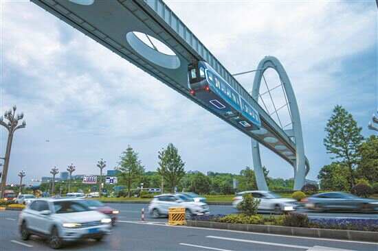 5月11日,国内首条悬挂式空中轨道列车——武汉光谷空轨试乘发车。空轨列车悬挂在单型轨道下方,将地面交通移至空中,属于立体交通,不受地面其他交通工具和行人干扰。该列车最高运行时速60公里,最多能容纳220余人,预计年内投运。新华社发