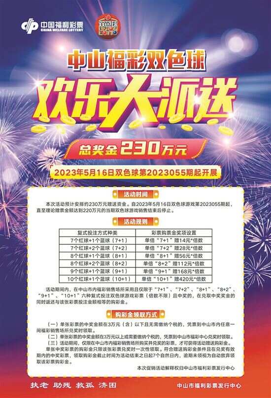 新快报讯 记者陆妍思 通讯员黄英杰报道 为了进一步宣传和提升双色球游戏品牌,促进双色球销售稳步发展,真情回馈一直以来支持双色球的彩民,中山市福彩中心决定从2023年5月16日起在全市范围内开展“福彩双色球,欢乐大派送”促销活动,彩民采用指定复式投注方式购买双色球彩票并中奖的,可额外获得等值购彩金,本次活动共安排约230万元赠送资金,赠送金额创历年新高。