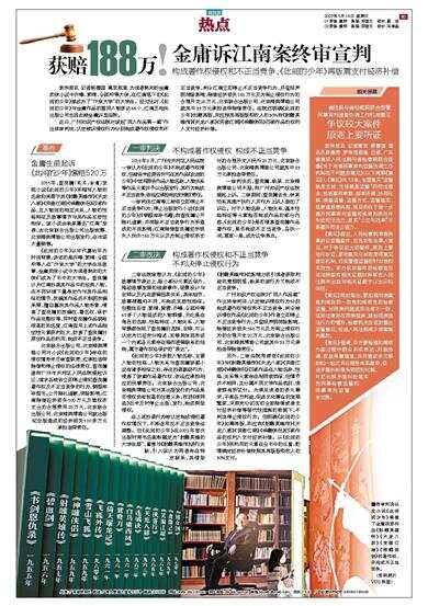 近日,广州知识产权法院对该起“同人作品第一案”作出终审判决,认定被诉侵权行为分别构成著作权侵权和不正当竞争,判令江南立即停止不正当竞争行为,并登报声明消除影响,赔偿经济损失168万元及为制止侵权行为的合理开支20万元,北京联合出版公司、北京精典博维公司就其中33万元承担连带赔偿责任。法院还明确《此间的少年》如需再版,则应按其再版版税收入的30%向《射雕英雄传》《天龙八部》《笑傲江湖》《神雕侠侣》四部作品的权利人支付经济补偿。