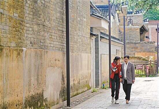 ■“童伴妈妈”卢婕(右)陪留守儿童张婷散步。张婷父母离异并在外务工,她从小跟着爷爷奶奶长大。卢婕试着和她做朋友,在生活上、学习上关心她。