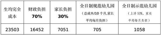 ■方案二:按“财政负担70%、家长负担30%”制定公办全日制规范幼儿园保教费标准为705元/月,公办全日制示范幼儿园保教费标准在此基础上上浮50%,标准为1058元/月。公办寄宿制幼儿园保教费标准在全日制收费标准上上浮30%。
