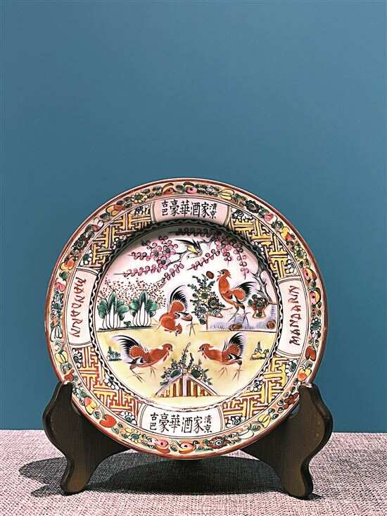 一件广彩绘斗鸡图碟(1950-1960年代),则是香港粤东广彩瓷厂产品,为古巴湾京豪华酒家定制,受广州广彩业的花式及市场偏好影响,采用了流行传统花式“斗鸡”图。应市场化需求,粤港澳三地广彩,均继承发扬了清至民国广彩的传统花式和工艺,它们不仅在这些方面同根同源,而且在产业发展上共生共荣。“随着广州市织金彩瓷厂借助广交会的平台壮大,内地陶瓷业恢复、振兴,作为转口港的香港亦发展起本土瓷业,并带动澳门瓷业一同繁荣。改革开放后,港澳瓷业陆续至内地设厂,形成港澳接单、内地生产的共荣格局,粤港澳广彩至1980年代均有飞速发展。”(通讯员谭倚云)