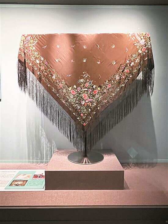 展览中,一件“广绣黑褐平纹绸葡萄蓝鸟牡丹纹大披巾”(1840-1850年),是2019年佛山市顺德区广绣庄刺绣品有限公司捐赠。它采用典型的1840年代流行图案,中间的十字架空白区有后加的小鸟和小花纹饰点缀,又与1850年的流行款式接近。大披巾原是南欧传统民族服饰。从清代至今,广州地区的刺绣工匠持续为西方市场制作此类披巾,成为广绣中十分重要的实用品类,见证了外销广绣的繁荣。尤其在西班牙等地,广绣大披巾已融入当地文化生活。19世纪末至20世纪初,出现了大量以身披大披巾的妩媚女子为主题的人物油画;盛大庆典场合或跳弗拉门戈舞蹈时,人们也习惯选用大披巾;直到今天,西班牙庆祝新春之始的传统节日中,大披巾仍是不可或缺的衣饰,西班牙皇室成员在国事场合亦常用大披巾。