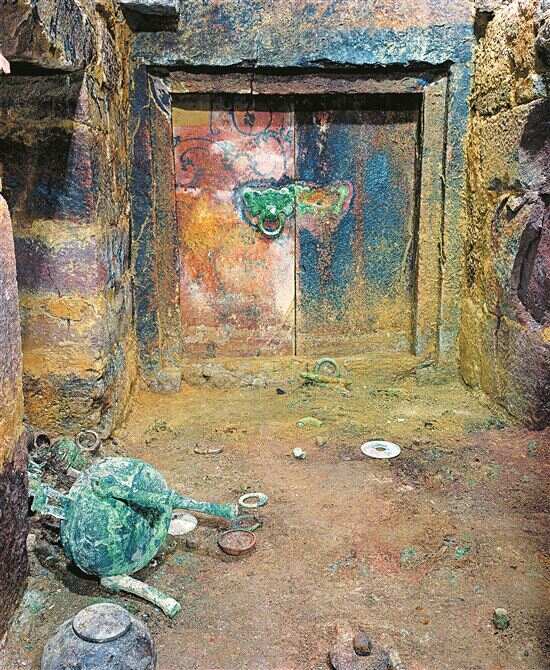 今天,当我们在古墓区,沿斜坡料峭直下,顺墓道、入前室,就可置身赵眜往生后之“寝宫”。主棺室干净凛冽,唯头顶低垂红砂岩,在被不知道是经自然或人为之力后,触手不觉粗砺,竟显温润。